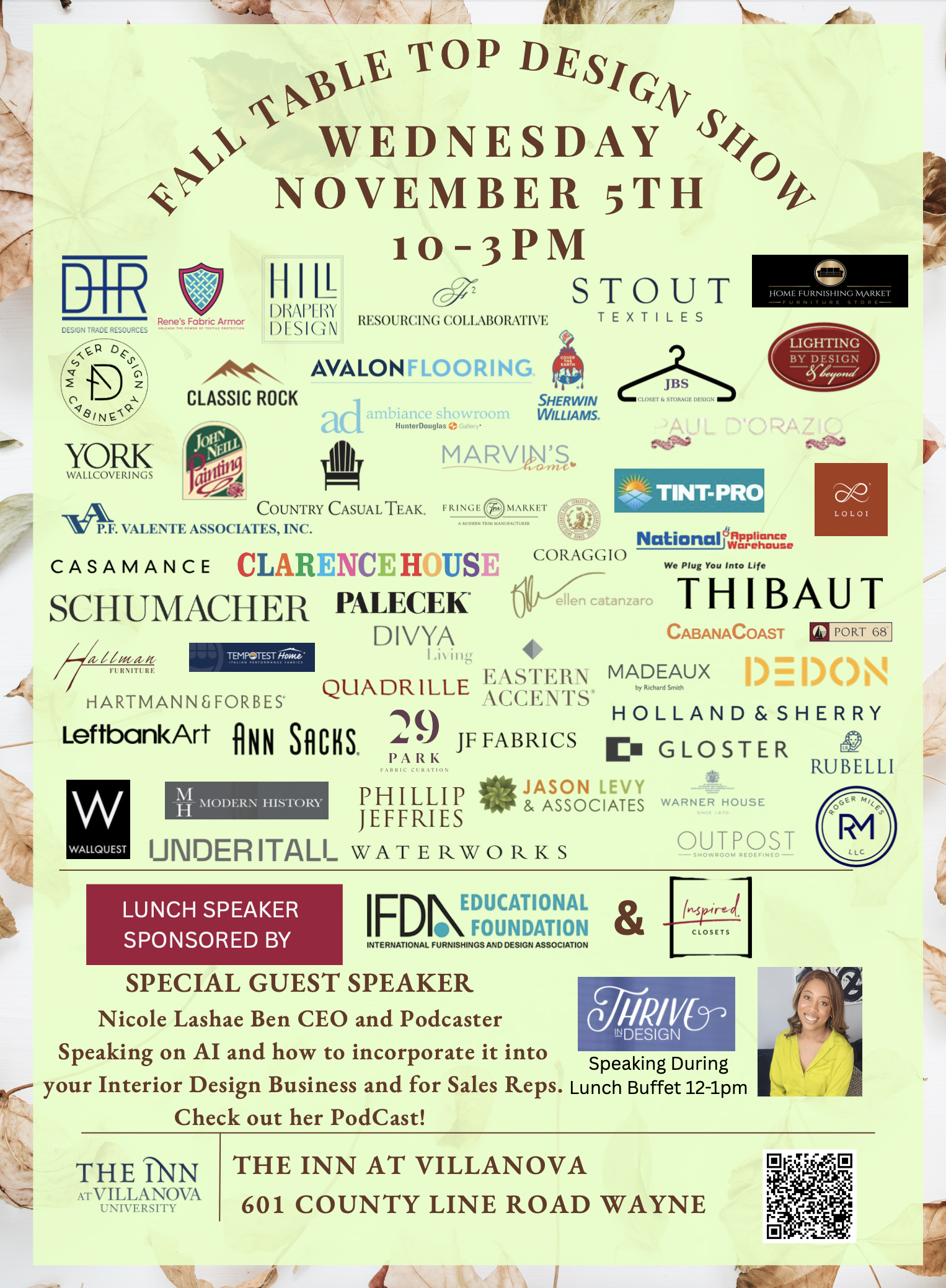 Join us for a fall Table Top show on the Main Line! Special guest speaker, Nicole Lashae Ben will be speaking at lunch on AI and how to incorporate it into your design business!